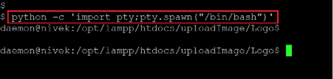 Command used: << python -c 'import pty;pty.spawn("/bin/bash")' >>
