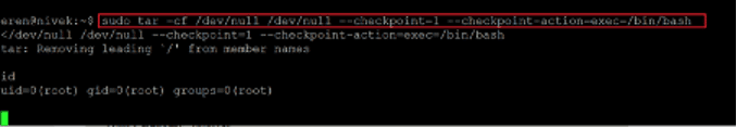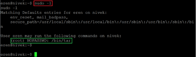 We are now logged into the target machine as user eren. We used the above command to check the sudo permissions of this user. We found that '/bin/tar' can be run as root.
