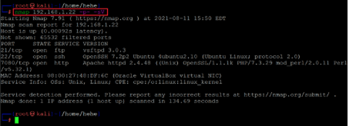 Command used: << nmap -sV -p- 192.168.1.22 >>