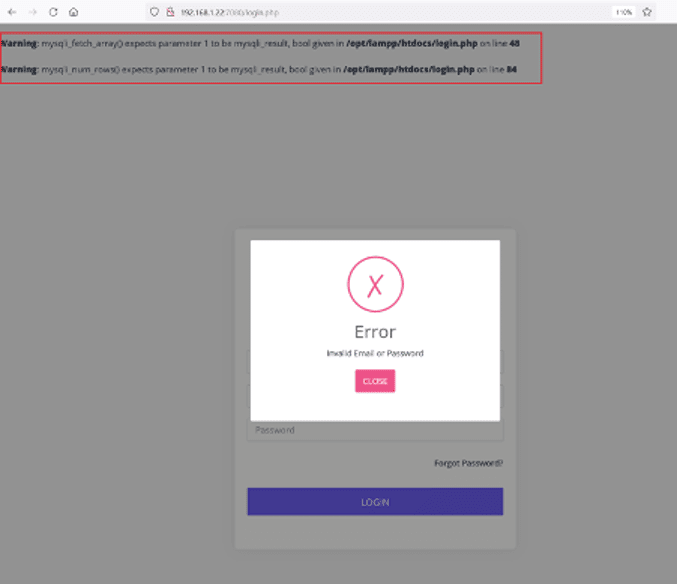 We tried our luck with some default usernames and passwords, but that did not work. We started testing the application for SQL Injection. During testing, we added a single quote in the email box, which gives an SQL error as follows: