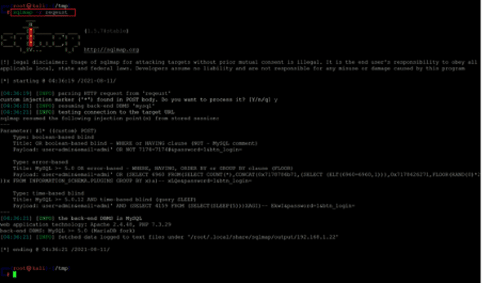 Command used: << sqlmap -r request >>
