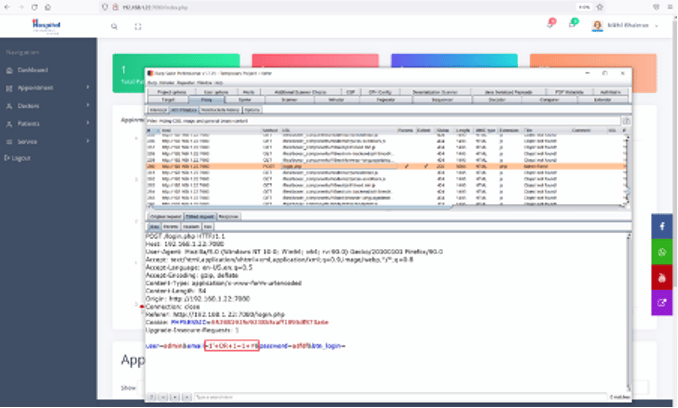 We know that the email id parameter is vulnerable to SQL injection. We tried authentication bypass for the login page. We bypassed the login page by putting the 'OR 1=1 -- payload as the email id input. As the application depends on client-side validation, we set up the burp proxy and intercepted the request and changed the payload as given below:
