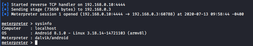 Bingo! We got the Meterpreter session of the Android device. We can check more details with the sysinfo command, as mentioned in the below screenshot.