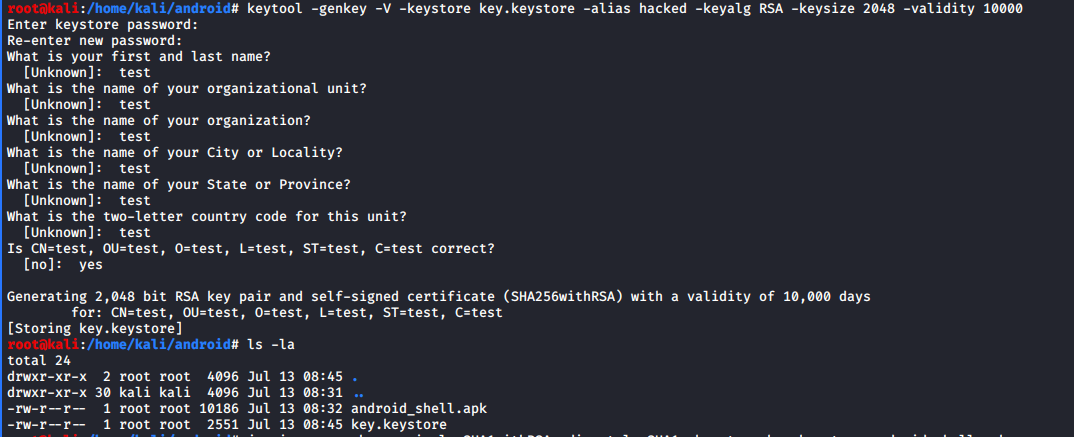 Terminal: keytool -genkey -V -keystore key.keystore -alias hacked -keyalg RSA -keysize 2048 -validity 10000