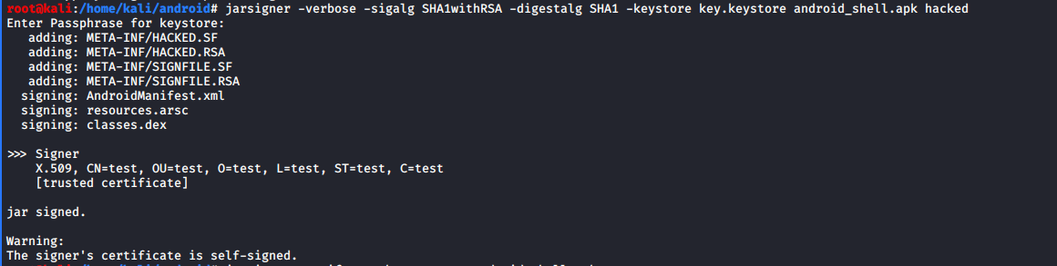 Terminal: jarsigner -verbose -sigalg SHA1withRSA -digestalg SHA1 -keystore key.keystore android_shell.apk hacked
