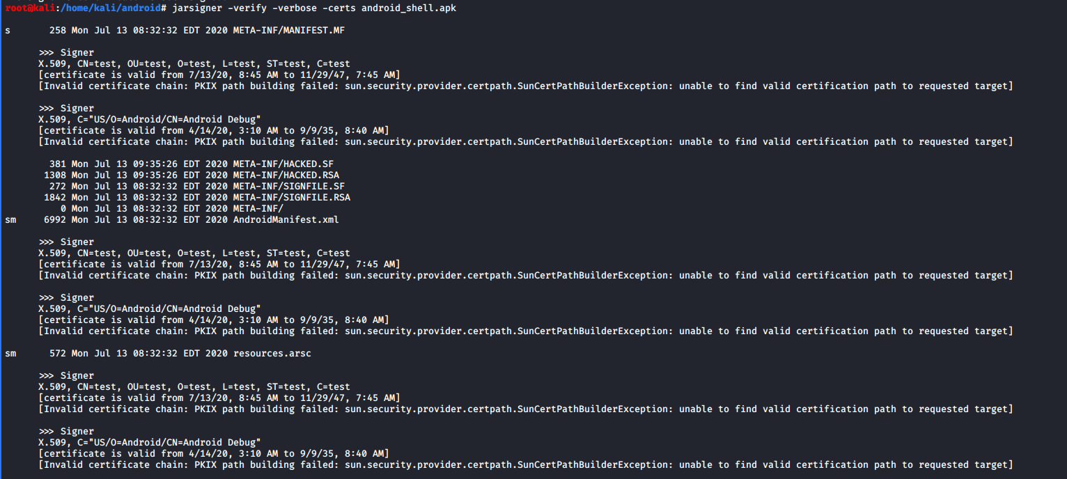 Terminal: jarsigner -verify -verbose -certs android_shell.apk