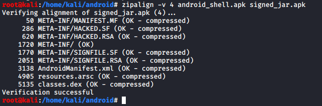 Now we have signed our android_shell.apk file successfully and it can be run on any Android environment. Our new filename is singed_jar.apk after the verification with Zipalign.