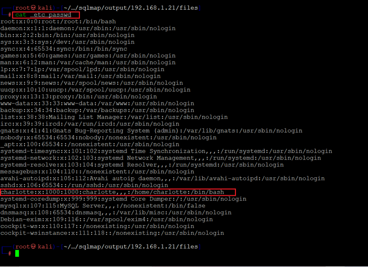 So, I read the "etc/passwd" file using SQLMAP. The command can be seen in the following screenshot.
