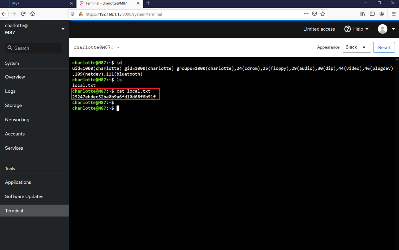 The first flag was named "local.txt" and could be found in the current directory. Now, as we know we are currently logged in as user "charlotte," but the goal of the CTF is to gain root access to the target machine. In the next step, we will take the reverse shell and try to get the root.