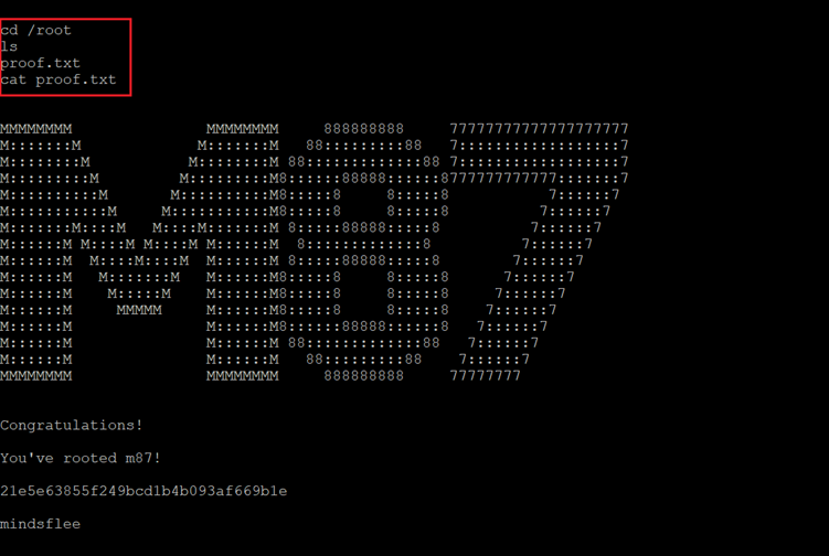 In the above screenshot, we can see the root flag. The root flag was named "proof.txt" and was found in the root directory on the target machine.
