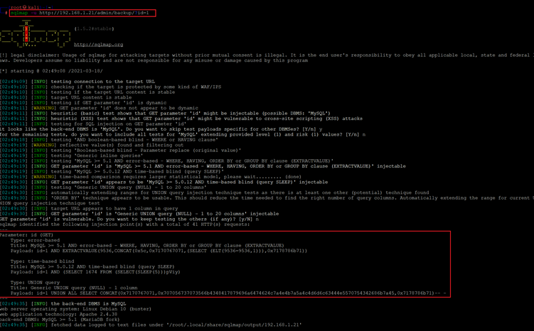Command used: << sqlmap -u http://192.168.1.21/admin/backup/?id=1 >>