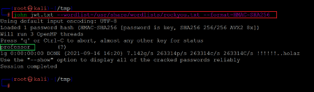 << john jwt.txt --wordlist=/usr/share/wordlists/rockyou.txt --format=HMAC-SHA256 >>