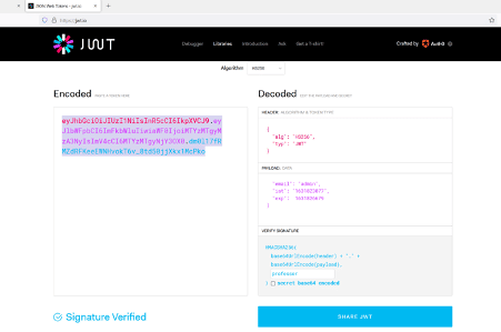 In the above screenshot, we used the 'john the ripper tool to identify the passphrase used as a signature for the JWT. The format was set to HMAC-SHA256, and we chose the default wordlist 'rockyou.txt.' After some time, the password hash was cracked as 'professor.' Now we know the key which is being used for signing the JWT token. In the next step, we will create a customized JWT token to access the admin user data.