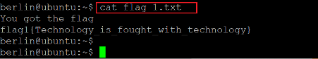 We used the identified credentials for logging into the target machine as user berlin. The login was successful, and we can access the target machine as user berlin. We checked the current directory contents and found the first flag as given in the screenshot that follows.