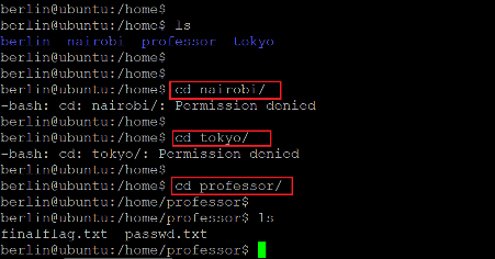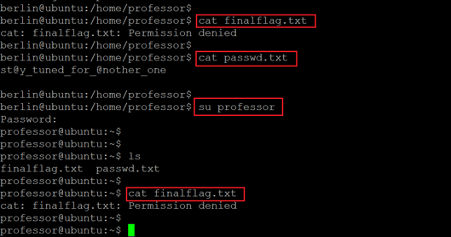 As can be seen above, there were four user folders in the home directory which means there are three other users on the target machine. We tried accessing the contents of the folders, but the access was denied for users Nairobi and Tokyo. We were allowed to see the contents of the folder 'professor.' The folder had another flag file named 'finalflag.txt.' However, when we tried opening the file using the cat command, we were denied access. This is shown below.
