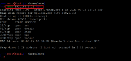 In the Nmap results, five ports have been identified as open. The open ports are ports 22, 53, 80, 3000 and 3001, which are used for SSH, domain service, HTTP, PPP and Nessus.