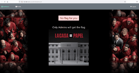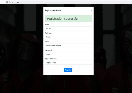 The target application has a nice money heist-themed image on the home page. There were login and signup functionality available. So, we decided to create a new user to login into the target application. The registration form as filled by us during registration can be seen below.
