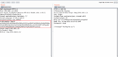 After being logged into the application on the dashboard, we got a message that there are no flags for non-admin accounts. Since we are not admin, we cannot access the flag. We started analyzing the target application through Burp suite proxy, as seen below.