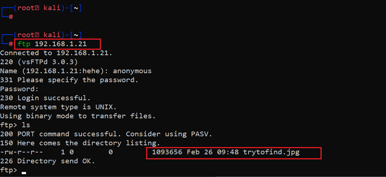 Command used: << ftp 192.168.1.21 >>