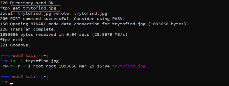 As we know the FTP port is open, we tried connecting to the FTP service as the "anonymous" user, the login was successful as "anonymous" user was enabled. After logging in, we checked the contents of the current directory using the "ls" command and found an image file. We noticed that the size of the image file was quite large. So, we decided to download this file for further analysis. The download process can be seen below.