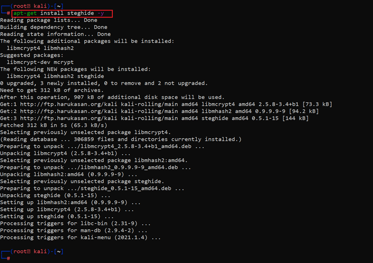 Command used: << apt-get install steghide -y >>