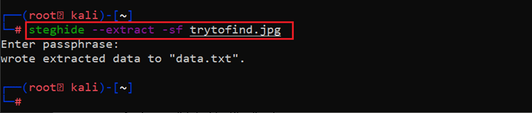 The secret key successfully worked as the command was successful. The tool extracted all the information from the image file and saved it in the "data.txt" file. Let us open the file with the help of the "cat" command which can be seen in the following screenshot.