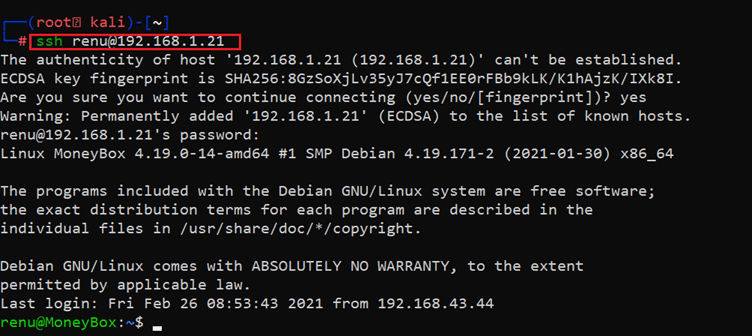 Command used: << ssh renu@192.168.1.21 >>