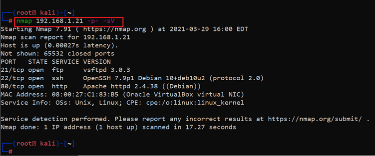 Command used: << namp 192.168.1.21 -p- -sV >>