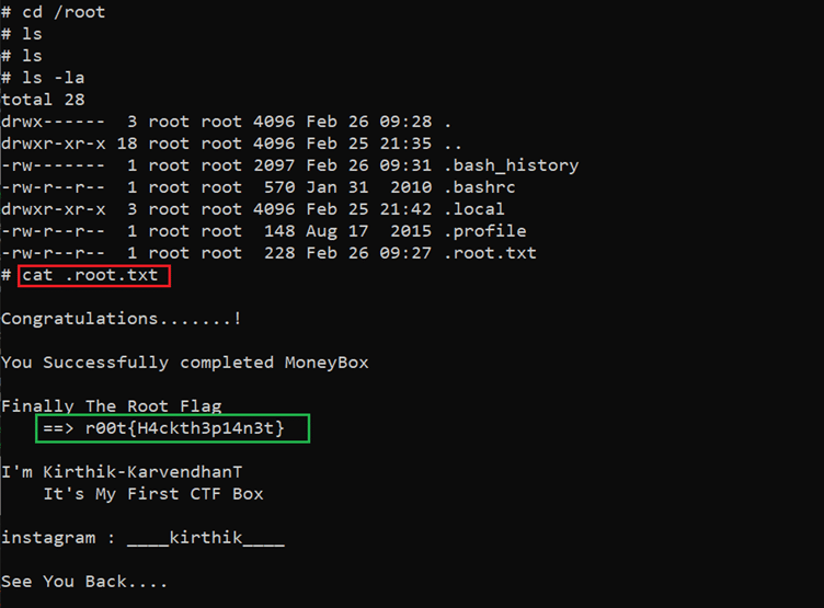 The root flag was easily found in the current directory, which can be seen above. We have completed all the things in the challenge and, hence, completed the CTF.