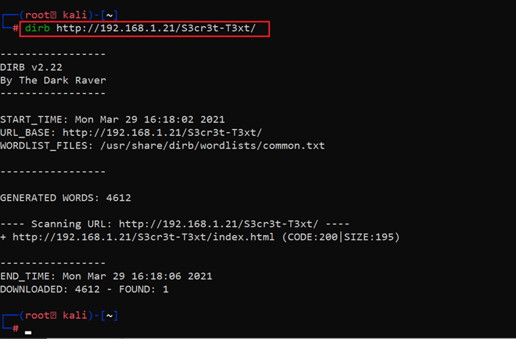 Command used: << dirb http://192.168.1.21/S3cr3t-T3xt/ >>