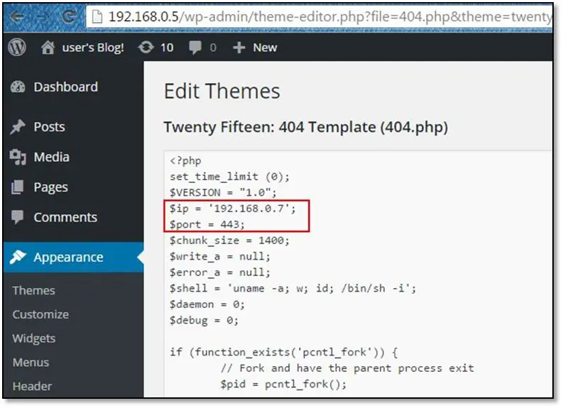 We replaced the whole source code of the 404.php file with the PHP reverse shellcode.