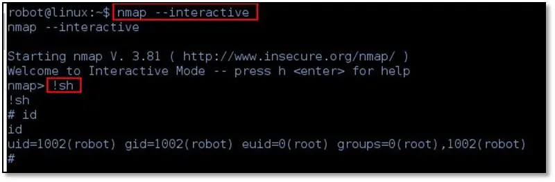 After that we typed in nmap --interactive and then type !sh which helped us to gain root access to the system.