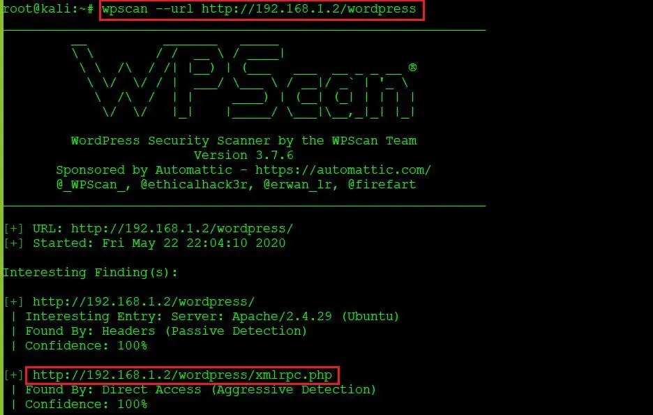 Command used: wpscan --url http://192.168.1.2/wordpress