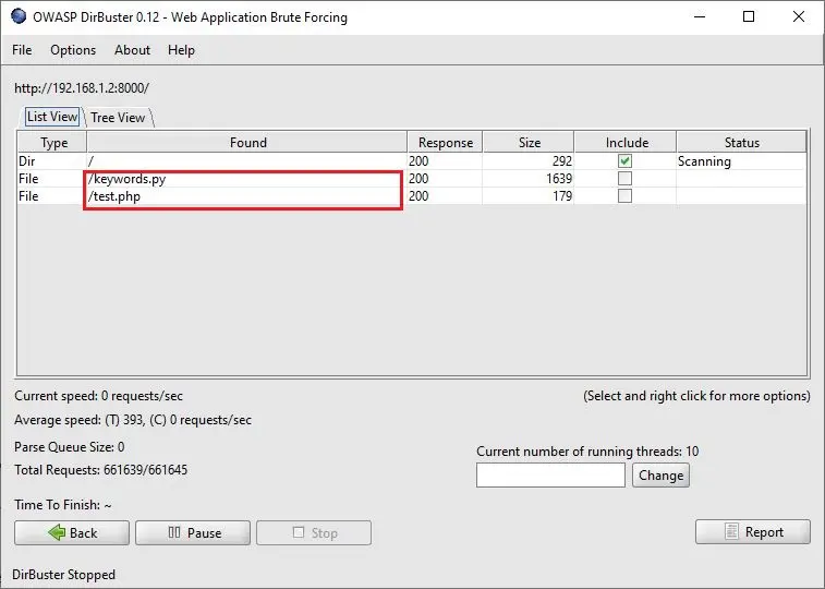 DirBuster is a tool that is used to identify the hidden directories. The output of the tool can be seen in the following screenshot.