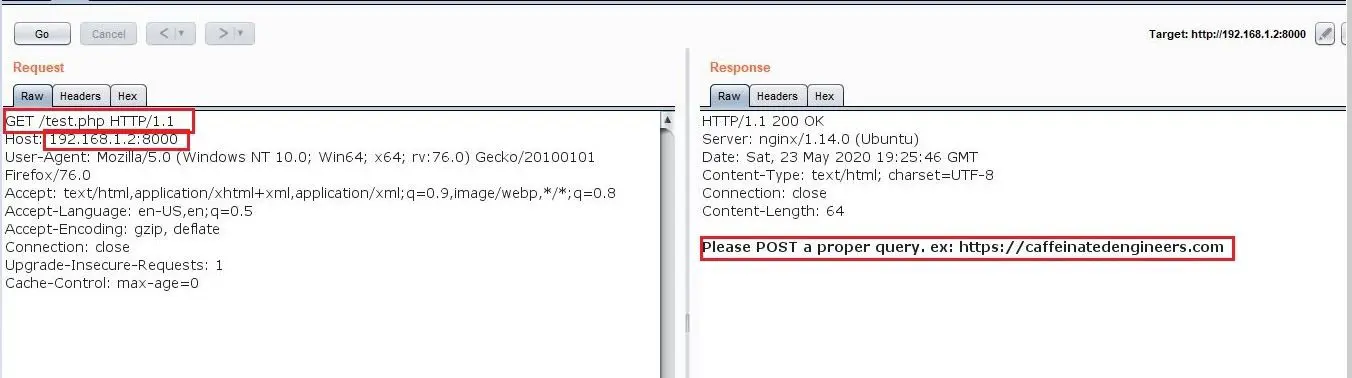 In this step, I am using the Burp Suite tool for intercepting the requests; you can use any intercepting proxy that you are comfortable with. I started by checking the “test.php” file. This can be seen in the highlighted area of the following screenshot.