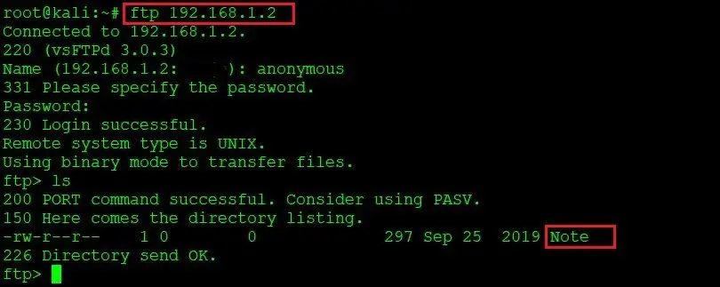 The above screenshot shows that we are able to log into the target machine with FTP default credentials. After that, I ran the ls command, which shows a file named “Note” available in the current directory. Let’s download this file from the target machine into our attacker machine and do some further analysis.