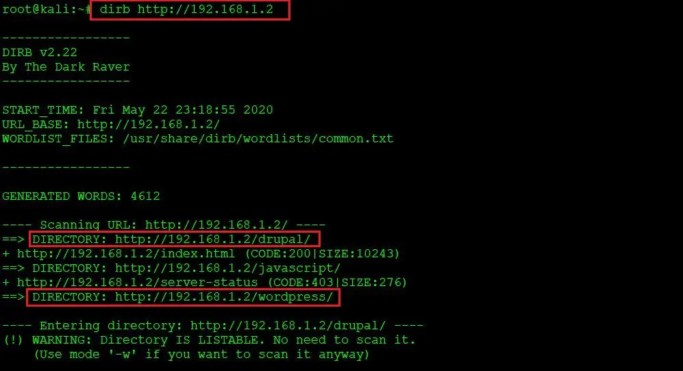 It was showing a default page. Now, let’s try to get more information on the web applications by running a dirb tool that will help us to identify some more entry points. I executed the dirb tool and the output of the scan can be seen in the following screenshot.