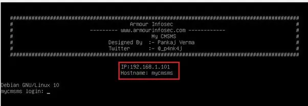 After running the downloaded virtual machine, the machine will automatically be assigned an IP address from the network DHCP and be visible on the login screen. The victim machine IP address can be seen in the following screenshot: [CLICK IMAGES TO ENLARGE]