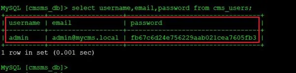 In the highlighted area of the above screenshot, we can see the cms_users table. We will select this table, as this contains all the user login credentials. We will fetch the admin login details from here and then log into the admin account in the application.