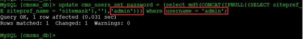 update cms_users set password = (select md5(CONCAT(IFNULL((SELECT sitepref_E sitepref_name=’sitemask’),’’),’admin’))) where username = ‘admin’;