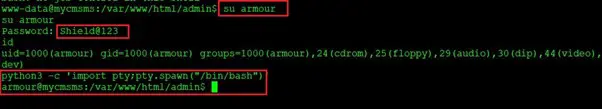 As we can see above, we finally got the username and password. As the shell access is limited, we can try using these credentials to log in as “armour” user. This can be seen in the screenshot given below.