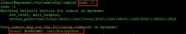 After getting the stable shell of the machine, we used a few commands to gather information about the current user and the running operation system and kernel version which seems to be not vulnerable for local exploit. We used the sudo –l command to check the armour user permissions and found that it is allowed to run Python as root user, which can be seen in the below screenshot: