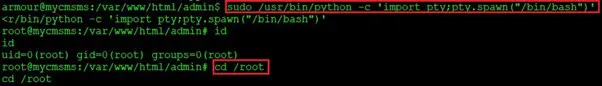 The credentials worked, and we are logged into the target machine as the user “armour”; but the goal of this challenge is to gain root access of the machine. We used a Python bin bash command to get the stable shell of the target machine.